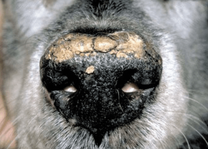 - Symptômes cutanés: hyperkératose (épaississement anormal (ou hyperplasie) de la couche cornée de l’épiderme) de la truffe et des coussinets plantaires.