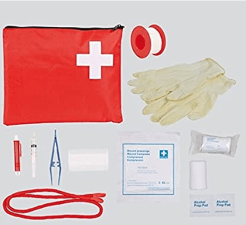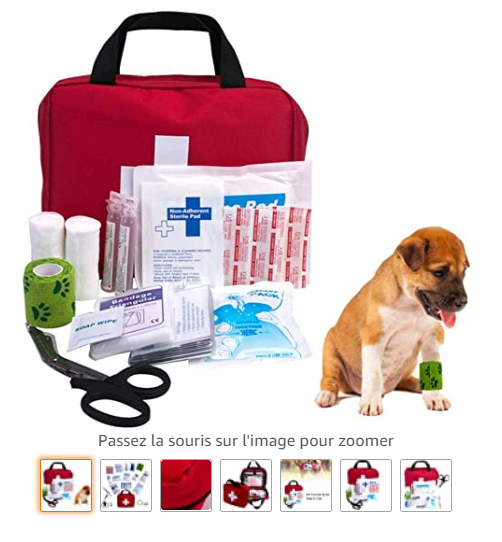 - Emportez une trousse de secours pour chien : ce kit de premiers soins pour chien contient les basiques indispensables, si vous n’en avez pas: