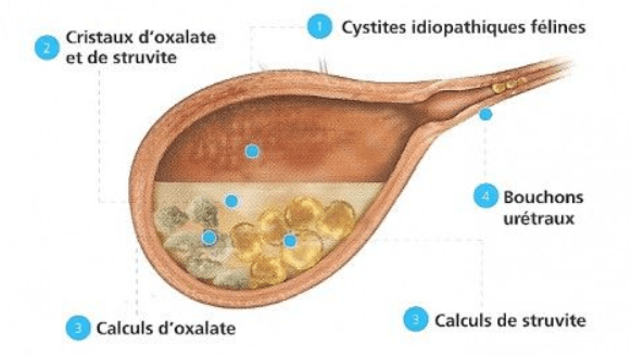 Les calculs urinaires se rencontrent également chez la femelle, mais ne provoquent généralement pas d’obstruction (1% chez la femelle contre 75% chez le mâle).