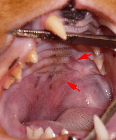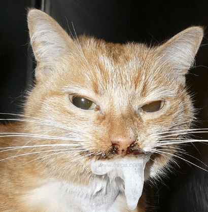 - Une stomatite ulcéreuse (inflammation de la cavité buccale du chat qui peut atteindre diverses portions de la bouche : les arcs palatoglosses, les gencives, le pharynx et/ou les joues) à l’origine d’un ptyalisme (sécrétion excessive de salive);