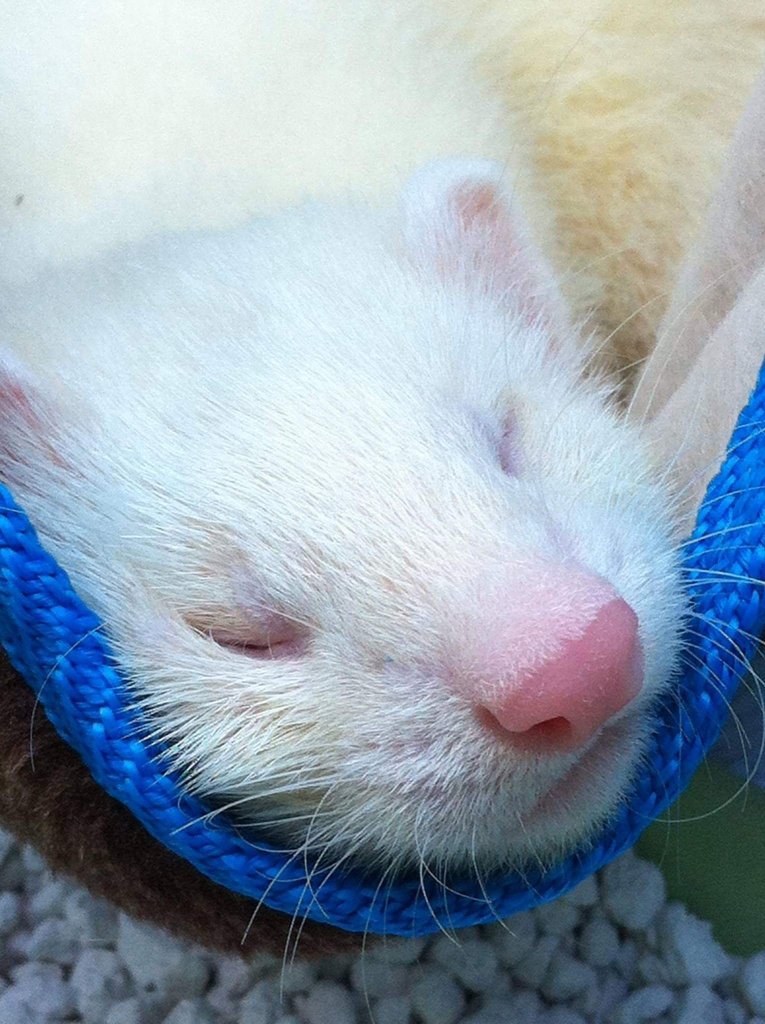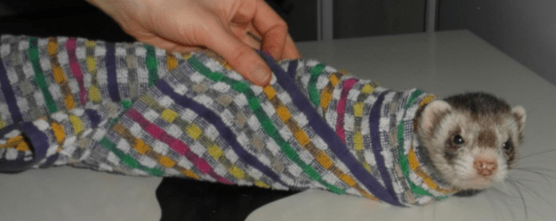 Si votre furet ne supporte pas du tout la contention et que vous devez lui faire des soins ( nettoyage des oreilles, coupe des griffes etc), vous pouvez l’envelopper dans une serviette.
