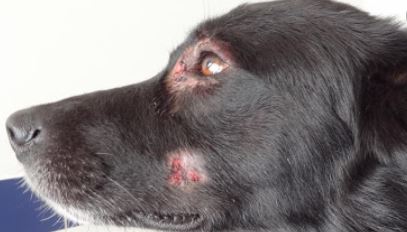 - Alopécie croûteuse sur la face de l’animal: pourtour des yeux, lèvres, chanfrein.