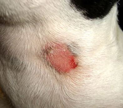 - Kérion*, plus fréquent chez le chien, donnant lieu à une forme suppurative avec infection bactérienne concomitante possible. Le kérion est essentiellement localisé à la tête, notamment au pourtour des lèvres, au chanfrein et au front. Le tégument parasité est rouge vif, tuméfié, en relief par rapport à la peau saine, formant un macaron circulaire saillant.