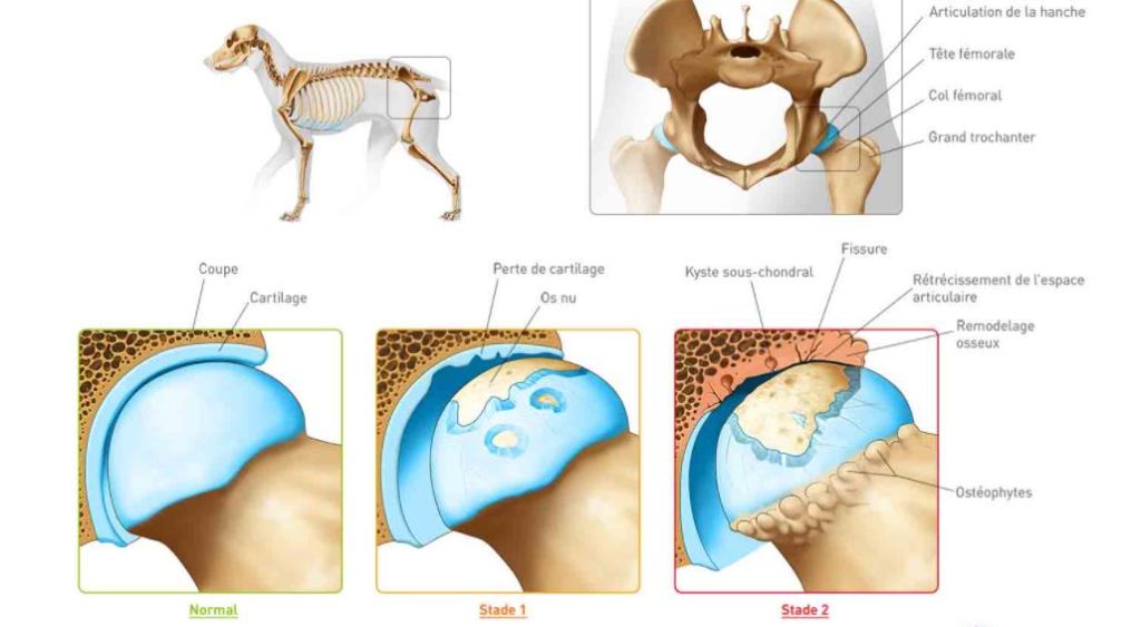 La dysplasie coxo-fémorale entraîne dans la quasi totalité des cas le développement d’une arthrose de la hanche. L’arthrose handicape le chien dans la mobilité de son articulation, et entraîne des boiteries plus ou moins précoces allant jusqu’à une impotence sévère, qui peut survenir très jeune.