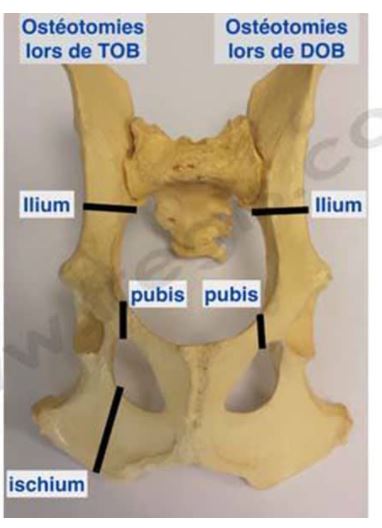 - La Triple Ostéotomie du Bassin (TOB): Elle consiste à modifier l’articulation de la hanche en changeant l’orientation de la partie rattachée au bassin (cavité articulaire du bassin appelée acétabulum).