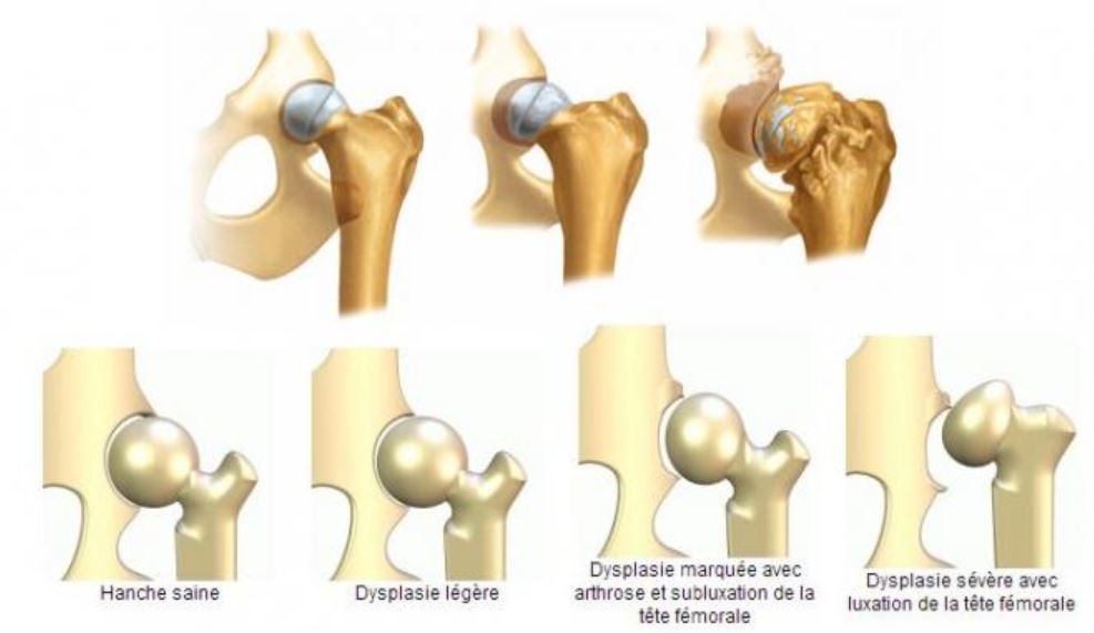 Elle se produit au niveau de l’articulation et se manifeste par une asymétrie de la tête du fémur avec la cavité de l’os du bassin qui doit normalement l’accueillir.